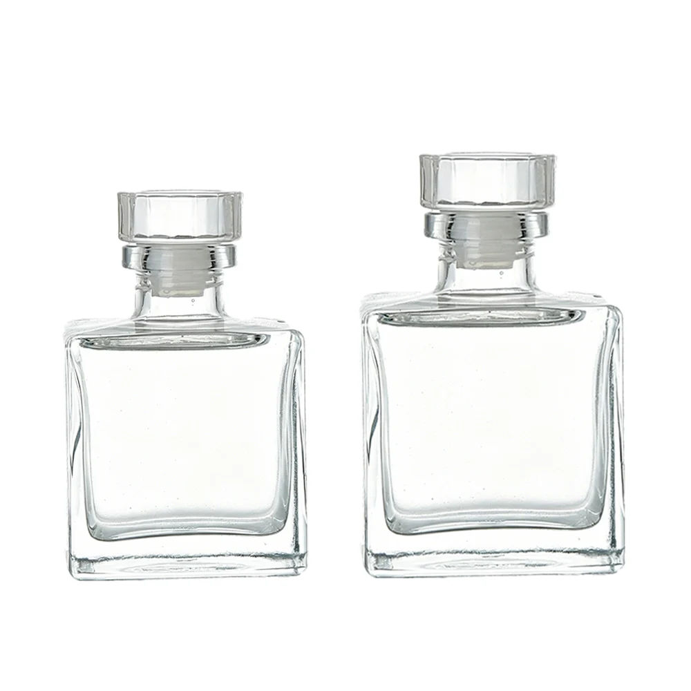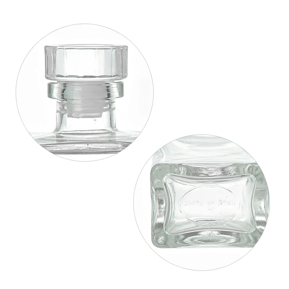 Les bouteilles d'alcool vides arborent un design carré moderne en verre ultra-transparent. Disponibles en deux formats, elles sont fournies avec un bouchon en verre transparent assorti.