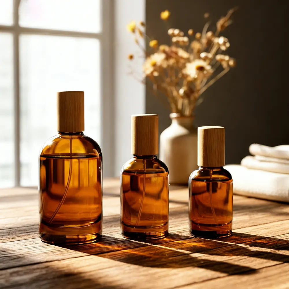 Discover amber glass perfume bottles with natural wood lids. This minimalist amber perfume bottle collection is ideal for niche scents. Fast Shipping!