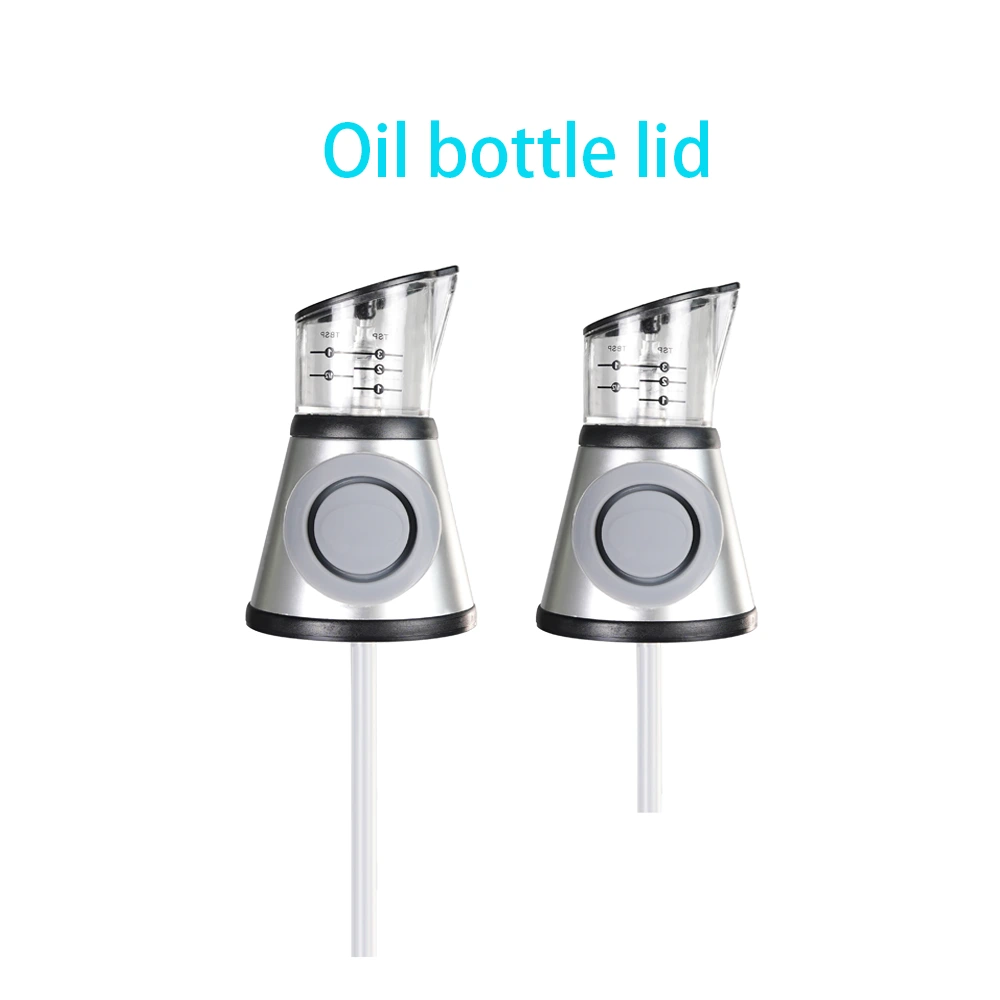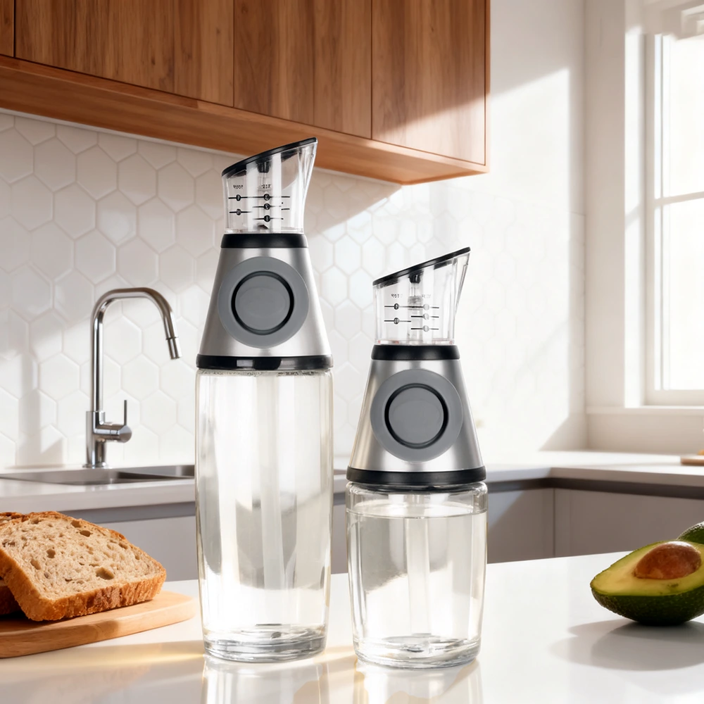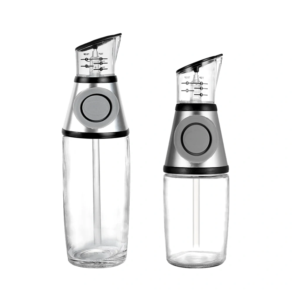This cooking oil bottle features a sleek, transparent glass body and a metal cap with graduated markings to ensure clean pouring. It comes in two sizes, perfect for kitchen use.
