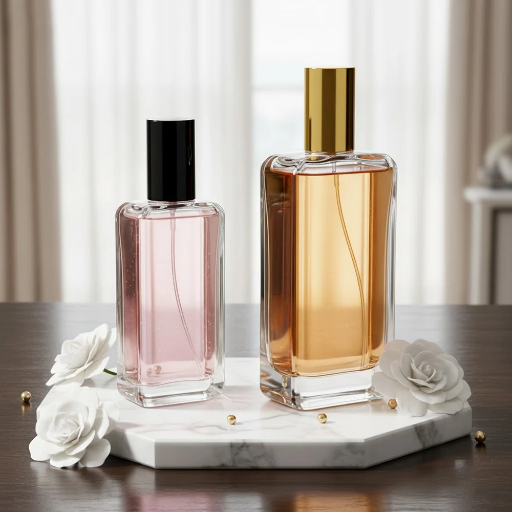Cologne empty bottles and cologne spray bottles for brands. Made with transparent glass and metal caps, available for bulk wholesale with fast shipping.
