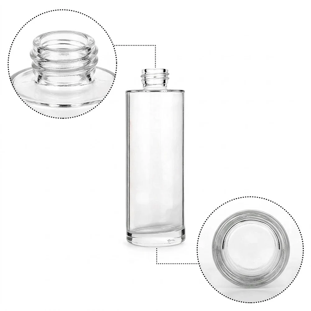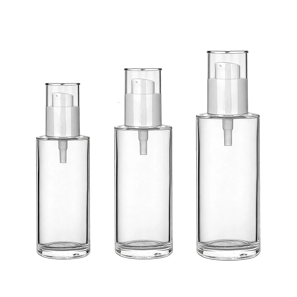 The glass pump bottles are cylindrical and are crafted of crystal clear glass, a white pump head and a transparent cap. They are in three sizes.