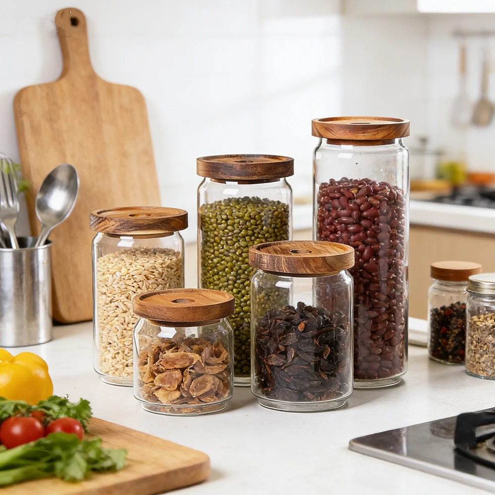 These​‍​‌‍​‍‌​‍​‌‍​‍‌ jars with wooden lids are manufactured from borosilicate glass that is transparent. For stability, the rounded edges and a slightly raised bottom are used. They are coupled with warm wood-grained lids that have natural textures and thus, by means of storing, the most common things become a lovely addition to any room.