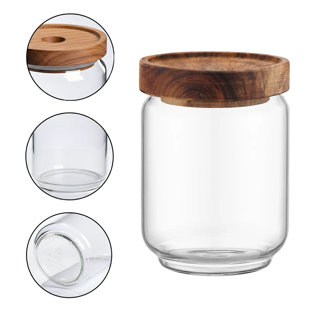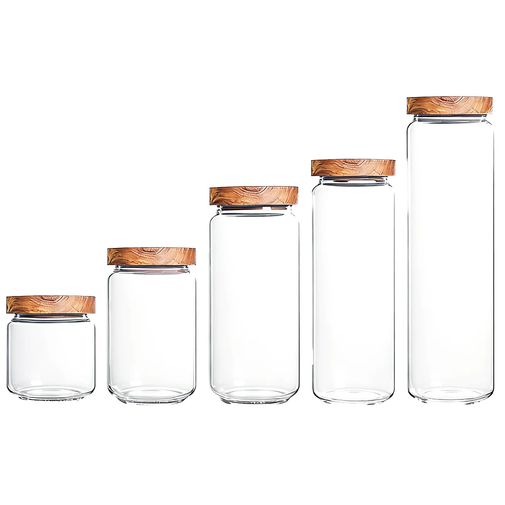 Premium jars with wooden lids, clear jars made from crystal-clear borosilicate glass, multiple sizes, ideal for pantry storage. Free samples available.