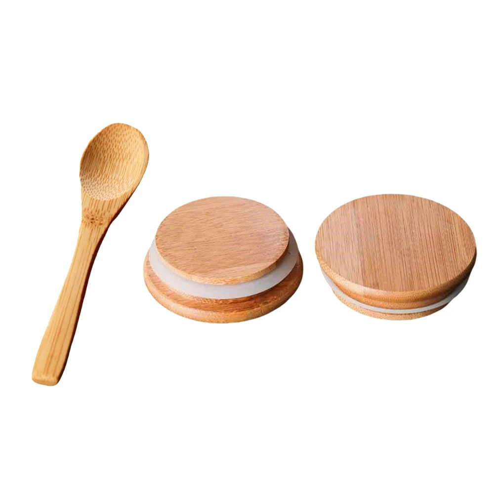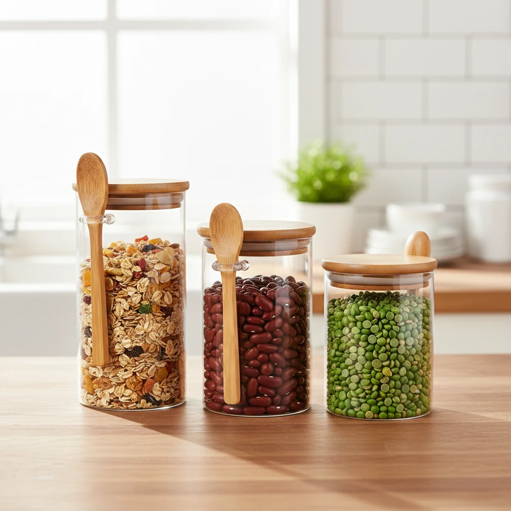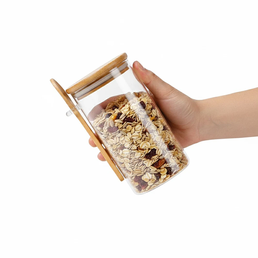 High-quality glass jar with lid and spoon featuring clear glass jars with lid, natural bamboo integrated spoon design in gradient sizes. Bulk order discounts.
