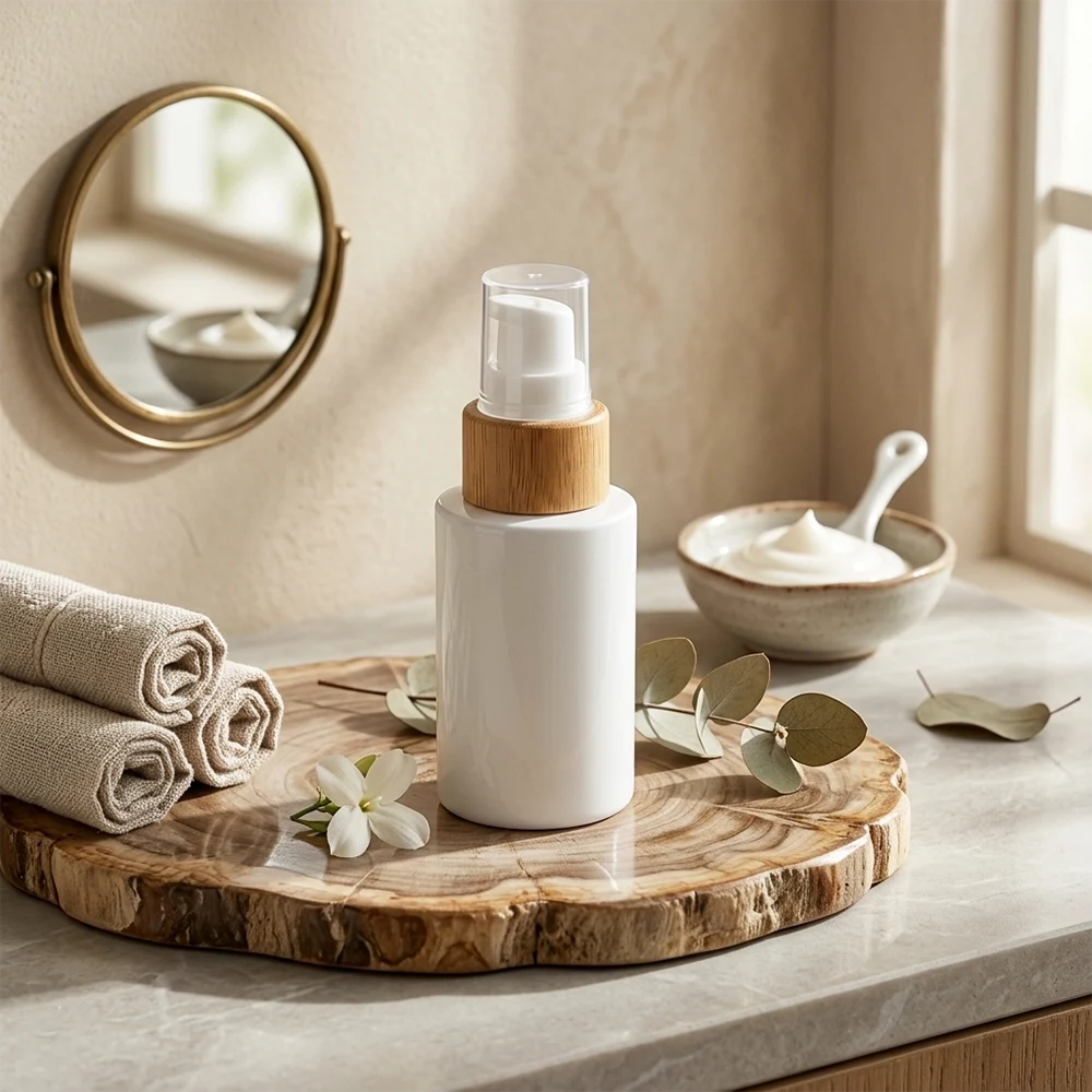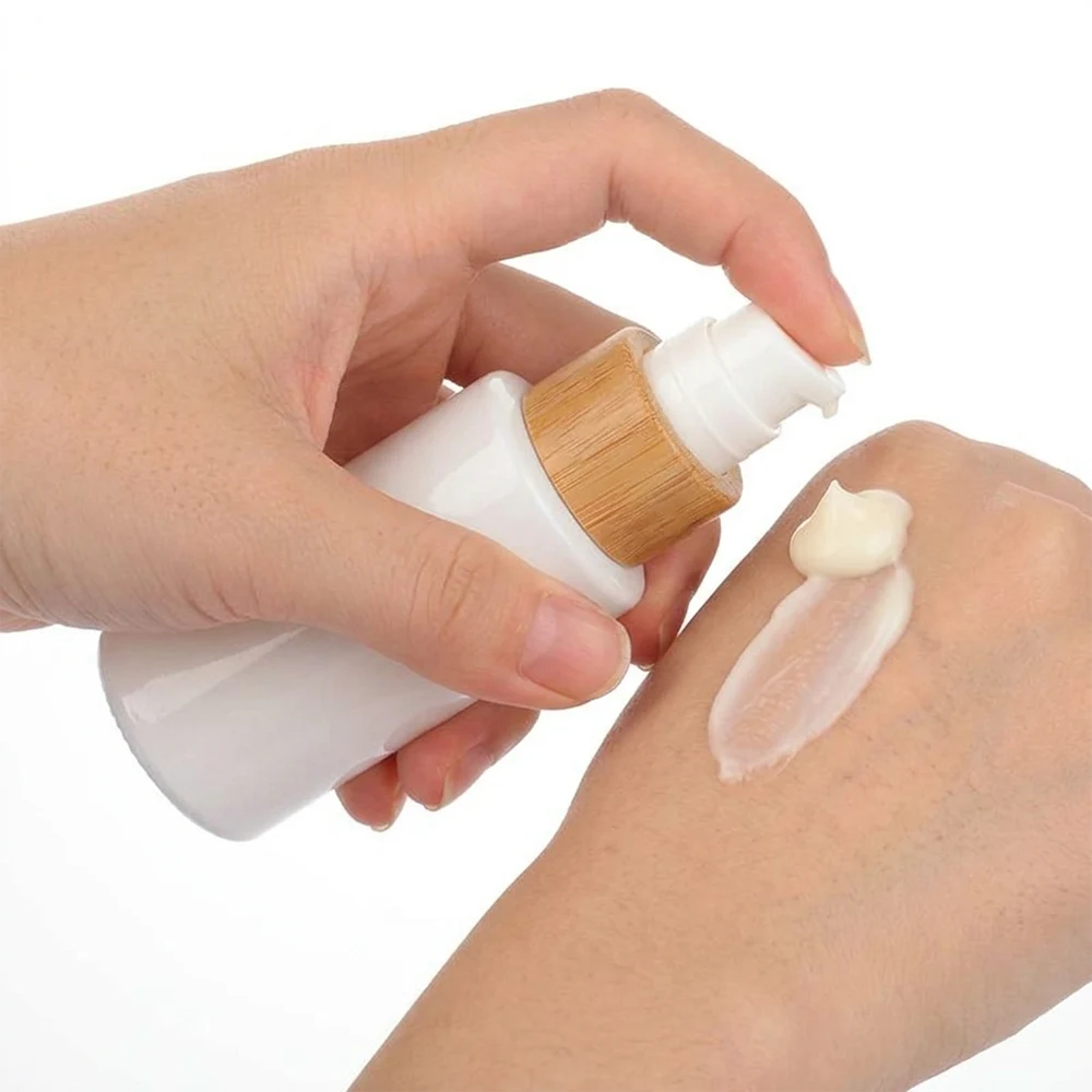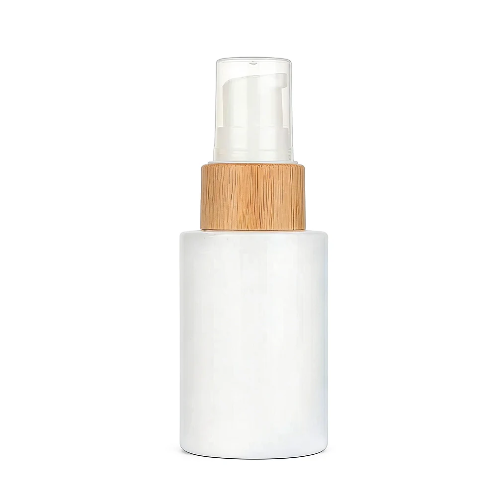 This is a white lotion bottle with a cylindrical form. The body is of clean white with a natural wood-grain neck, which perfectly matches the white dispenser of the pump, which is eco-friendly.