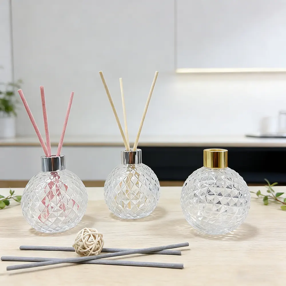 Diffuser bottles designed as a clear reed diffuser for home fragrance brands. Factory direct supply with bulk customization and fast shipping available.