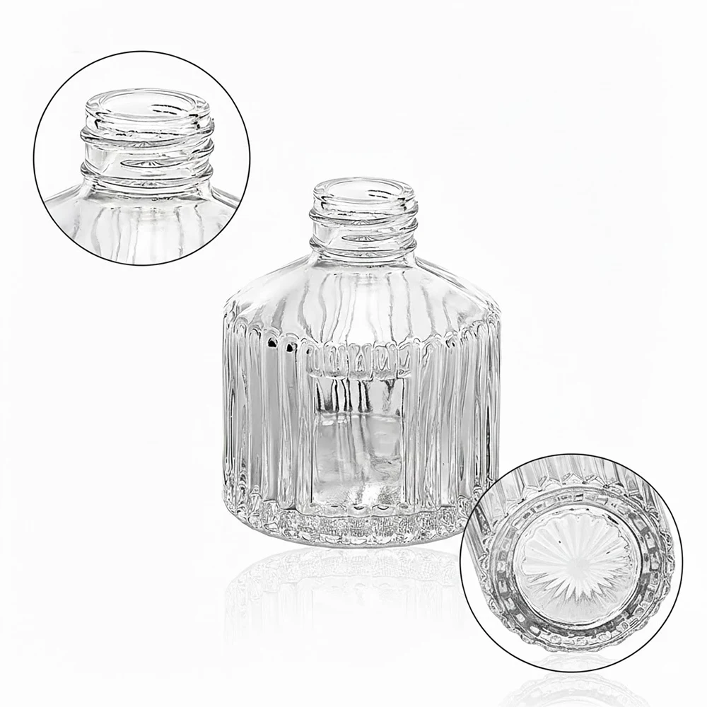 These empty glass diffuser bottles come with a cylindrical shape. The clear glass container features decorative vertical grooves to the finish, and the bottom side is engraved with attractive patterns. The multi, screw neck design is both useful and beautiful.