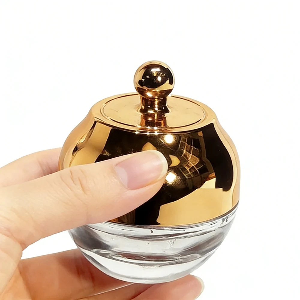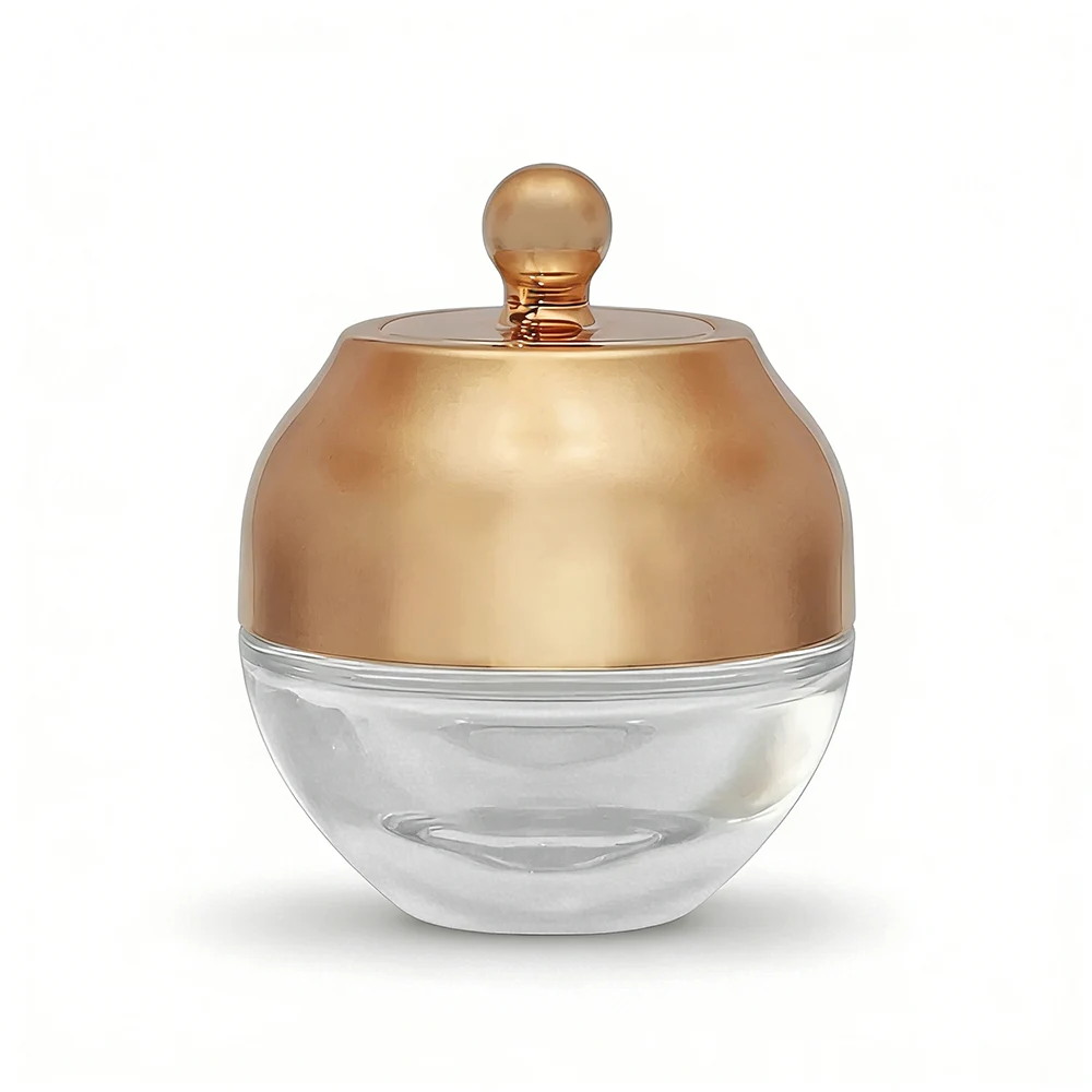 These luxury glass cosmetic jars in cosmetic make up have a smooth roundish shape, made of crystal clear glass and topped with a gold plated lid and opulent spherical knob that contribute to their luxurious touch.