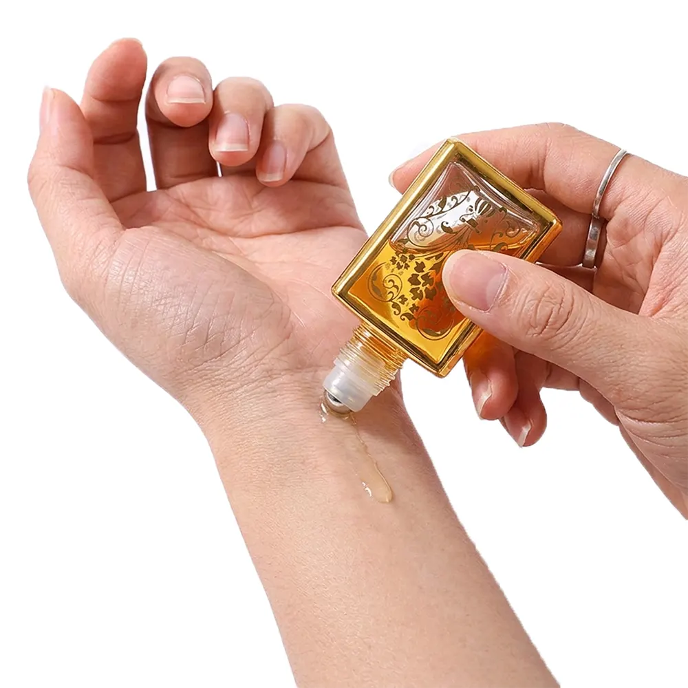 The essential oil roller bottle is a roll-on and is of a rectangular shape with a flat design. It is crafted of heavy glass that is gold-plated and therefore has a metallic polish. The balance of the bottle is achieved through the wide and stable base and straight sides, making it perfect to display. Such glass roll-on bottles are to be used with perfumes, essential oils, or liquid cosmetics, and they are practical and beautiful at the same time.