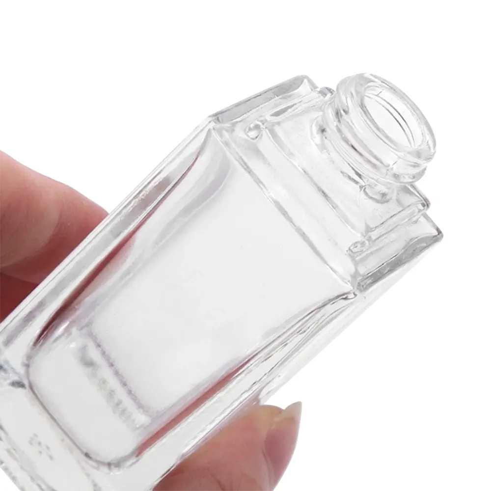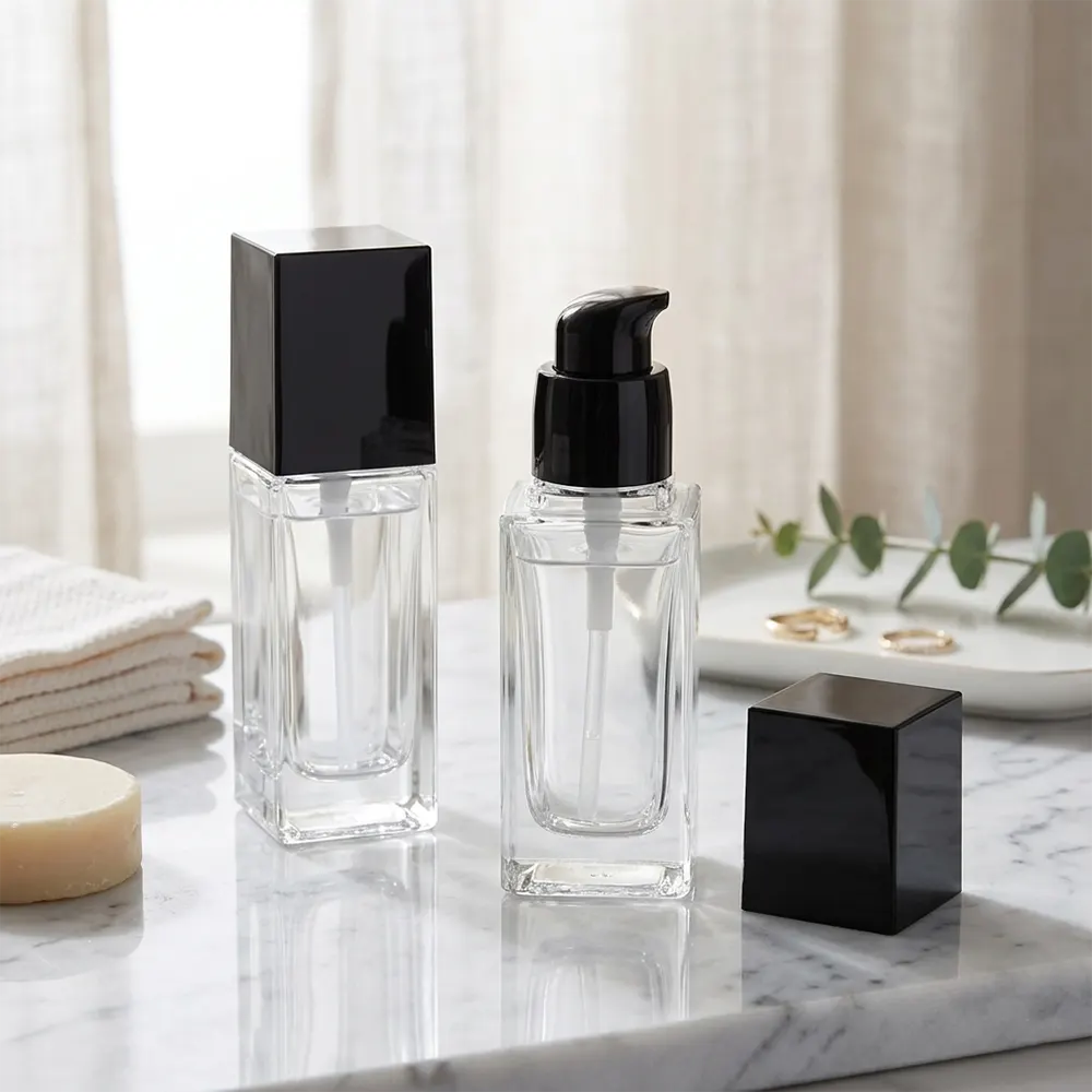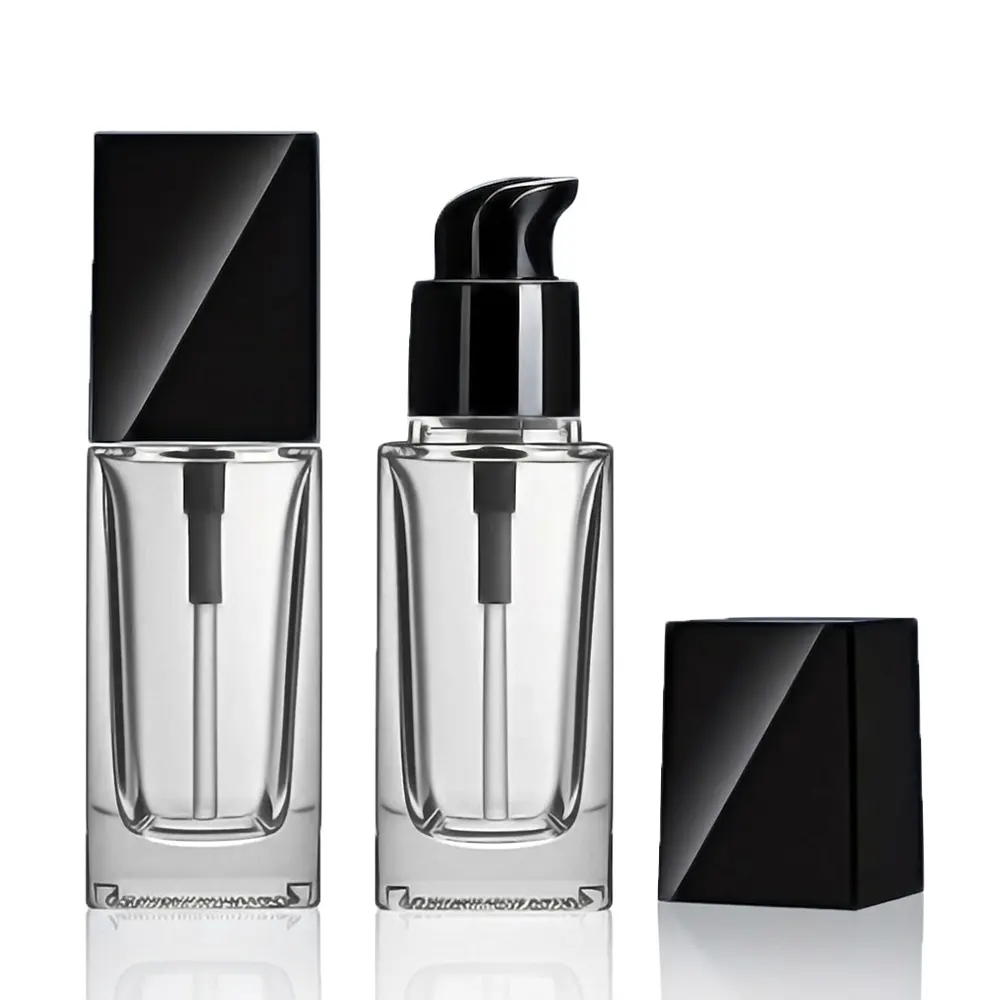 | 30ml | Clear Glass with Black/White Lids | Rectangular | Cosmetic Packing |