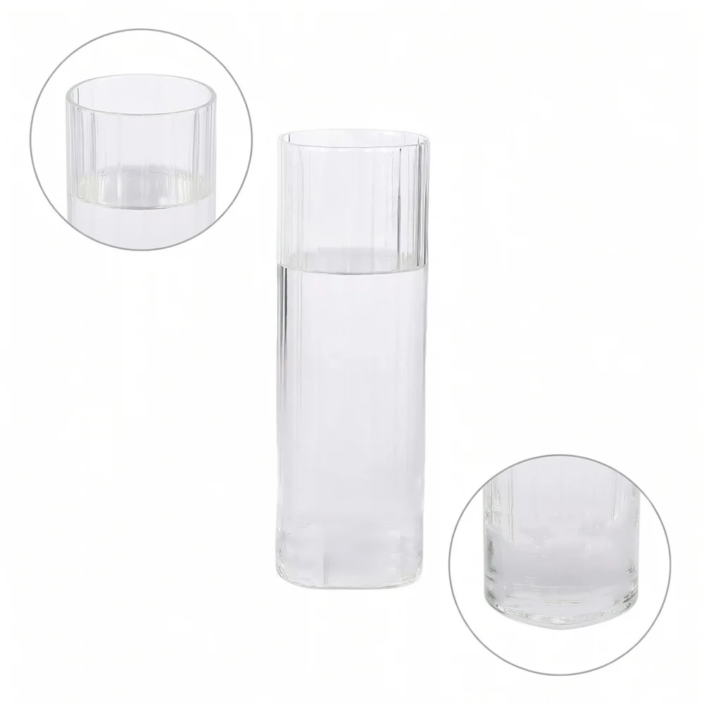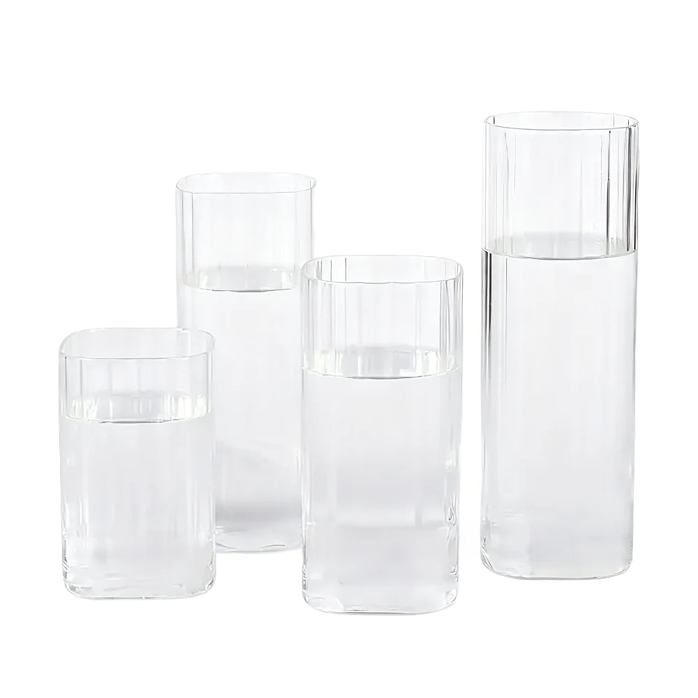 These square glass vases display a modern design through their square shape which artists constructed using crystal-clear glass that shows deep vertical grooves throughout its body. The product comes in four distinct size options.