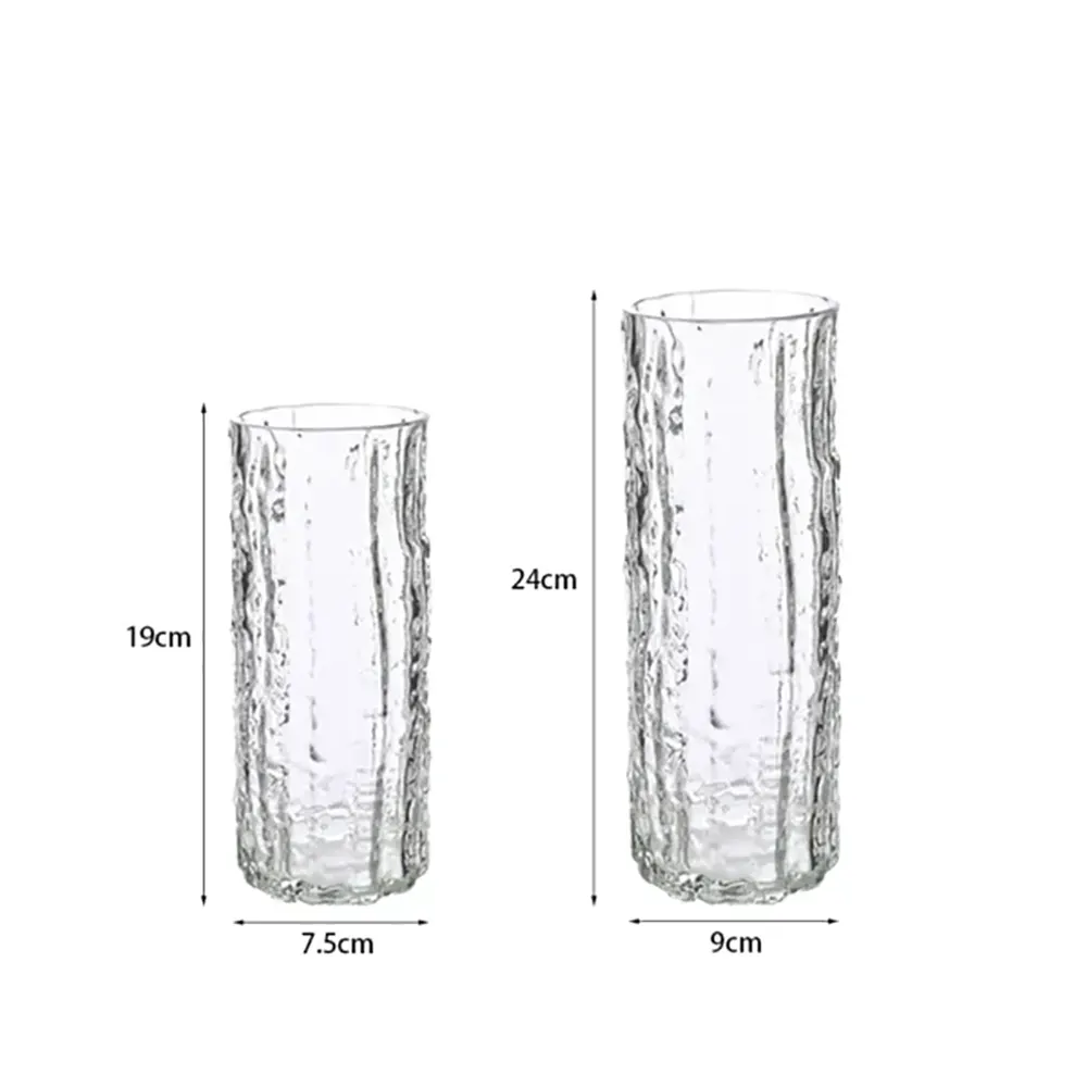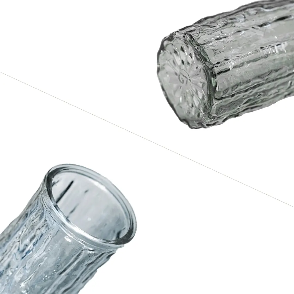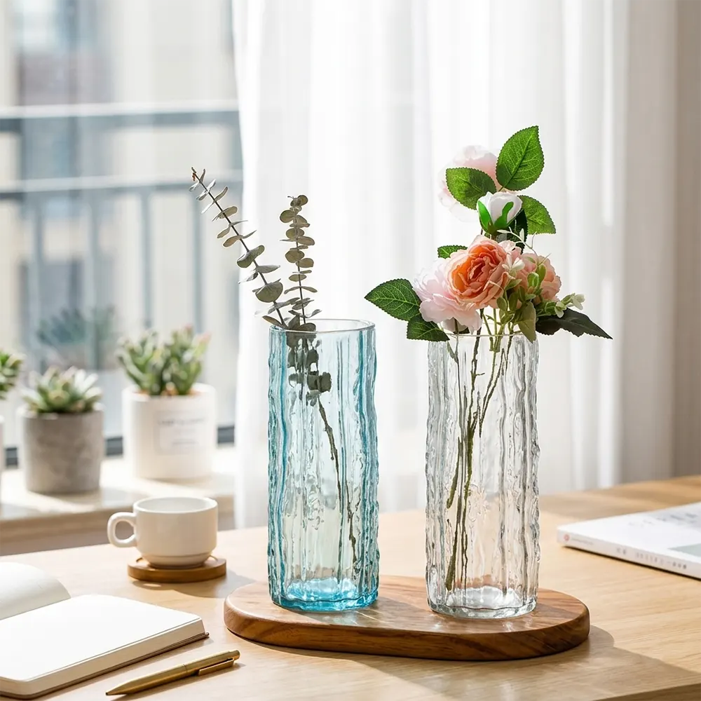 The cylinders exist as tall structures because their construction uses transparent and translucent colored glass. The vase displays vertical irregular textures which create a water-like flow effect to produce beautiful light refractions and visual depth. The design offers four color options which include sleek blues and soft grays and warm ambers and crystal-clear finishes to create different aesthetic effects. The straight opening with sharp edges enables easy flower arrangement between a single stem and a full cascading bouquet.