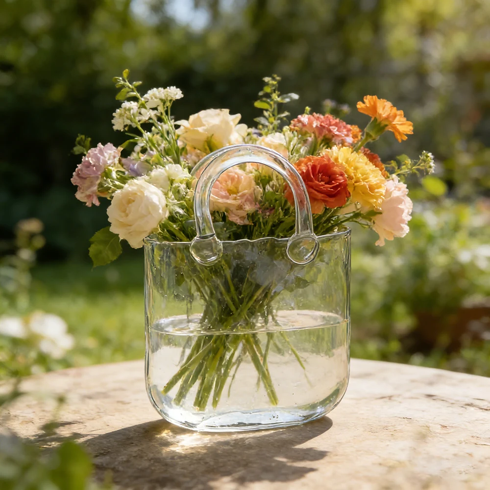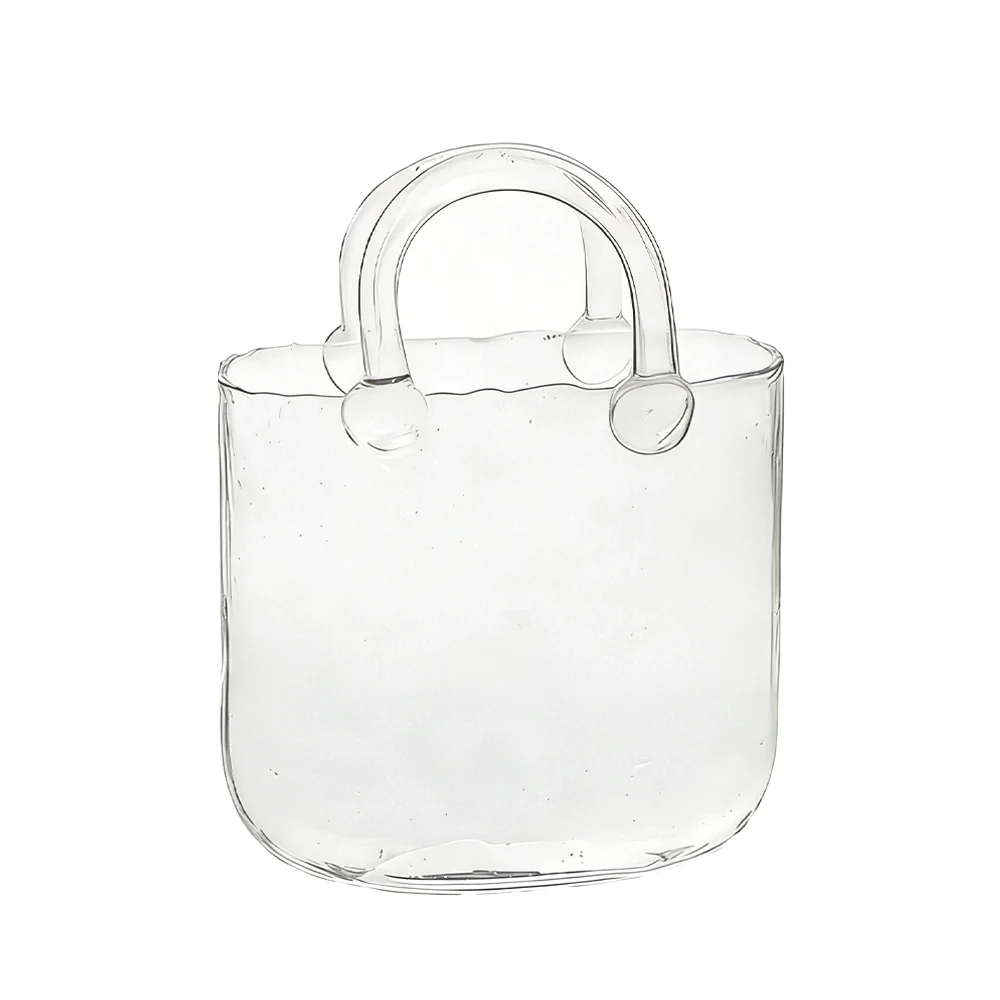 These unique flower vases are styled as classic handbags, with each piece made to the highest standards of clear glass workmanship. Each vase has a well-defined square body, a softly rounded base and a naturally wavy neck. Most of all, there is the uniquely formed curved glass handle which is a part of the wavy neck.