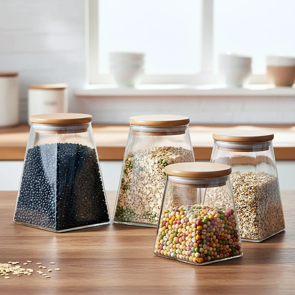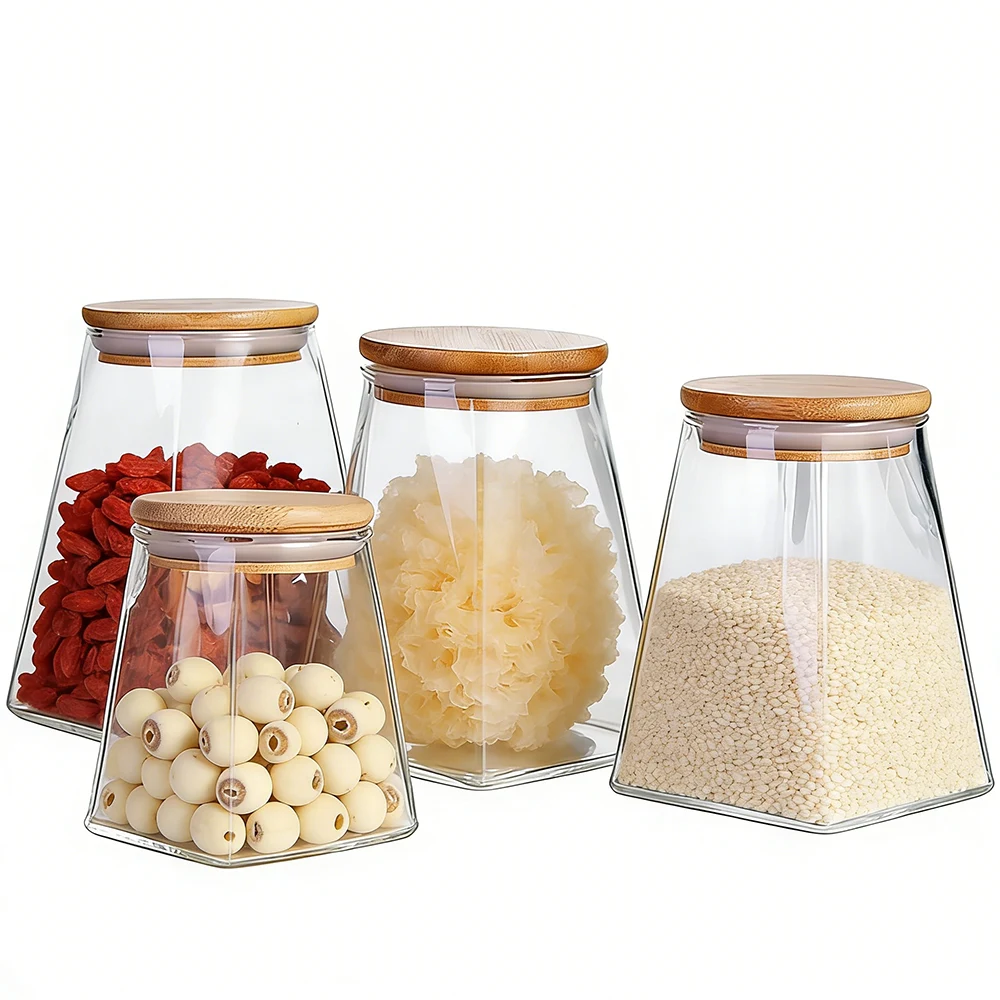 These unique glass jars with lids are crafted of fully transparent borosilicate glass. They are made of jars that are trapezoidal (truncated cone) with a top of the jar tapering and the bottom of the jar being polygonal with a flat lid made of light beige bamboo.