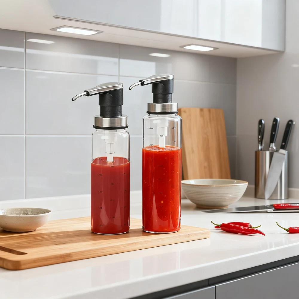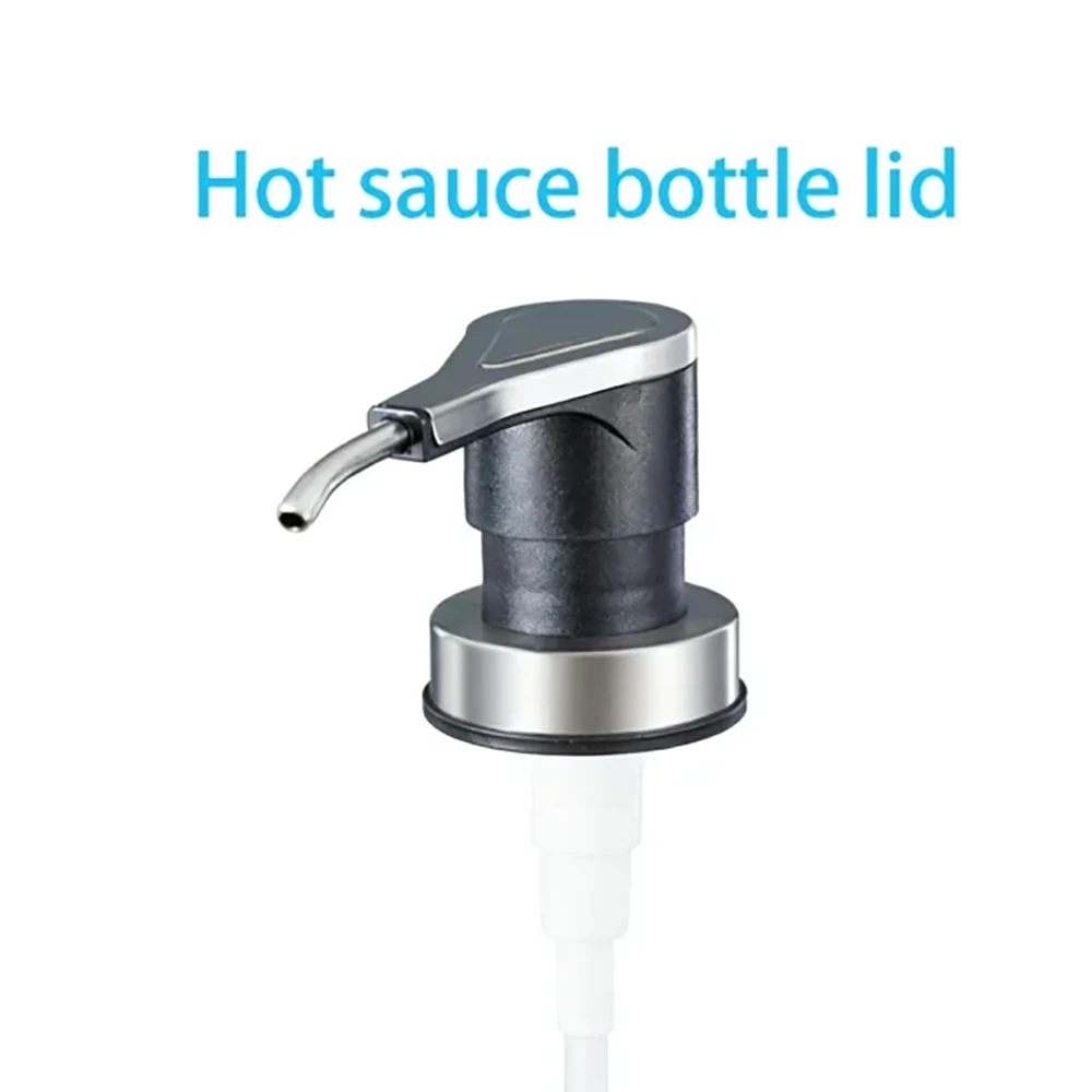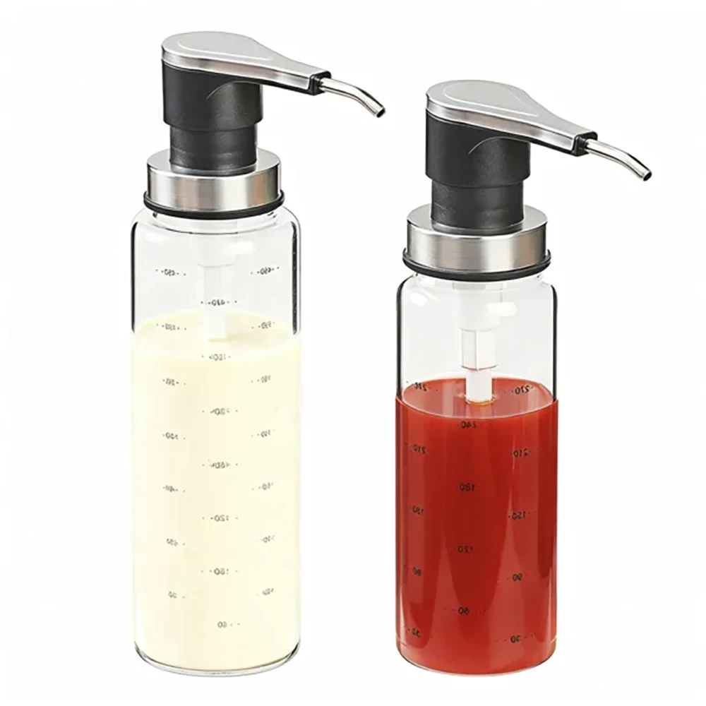 This empty bottles for hot sauce handy push-button container is made of transparent glass and features a graduated silver-colored metal pump. It can simply serve as a light sauce bottle or as a general-purpose vessel for other sauces.