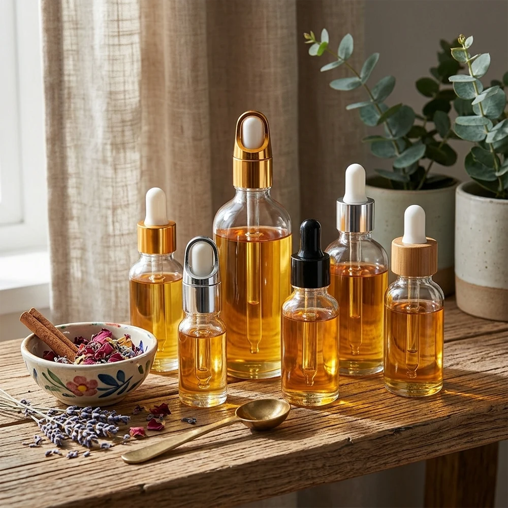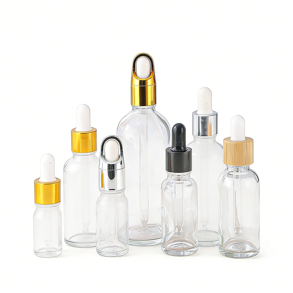 这些带滴管的玻璃瓶采用优质晶莹剔透的玻璃制成,线条流畅优美。它们有多种尺寸可供选择,并配有时尚的金色、银色、黑色和木纹滴管盖,用于包装精油和精华液。